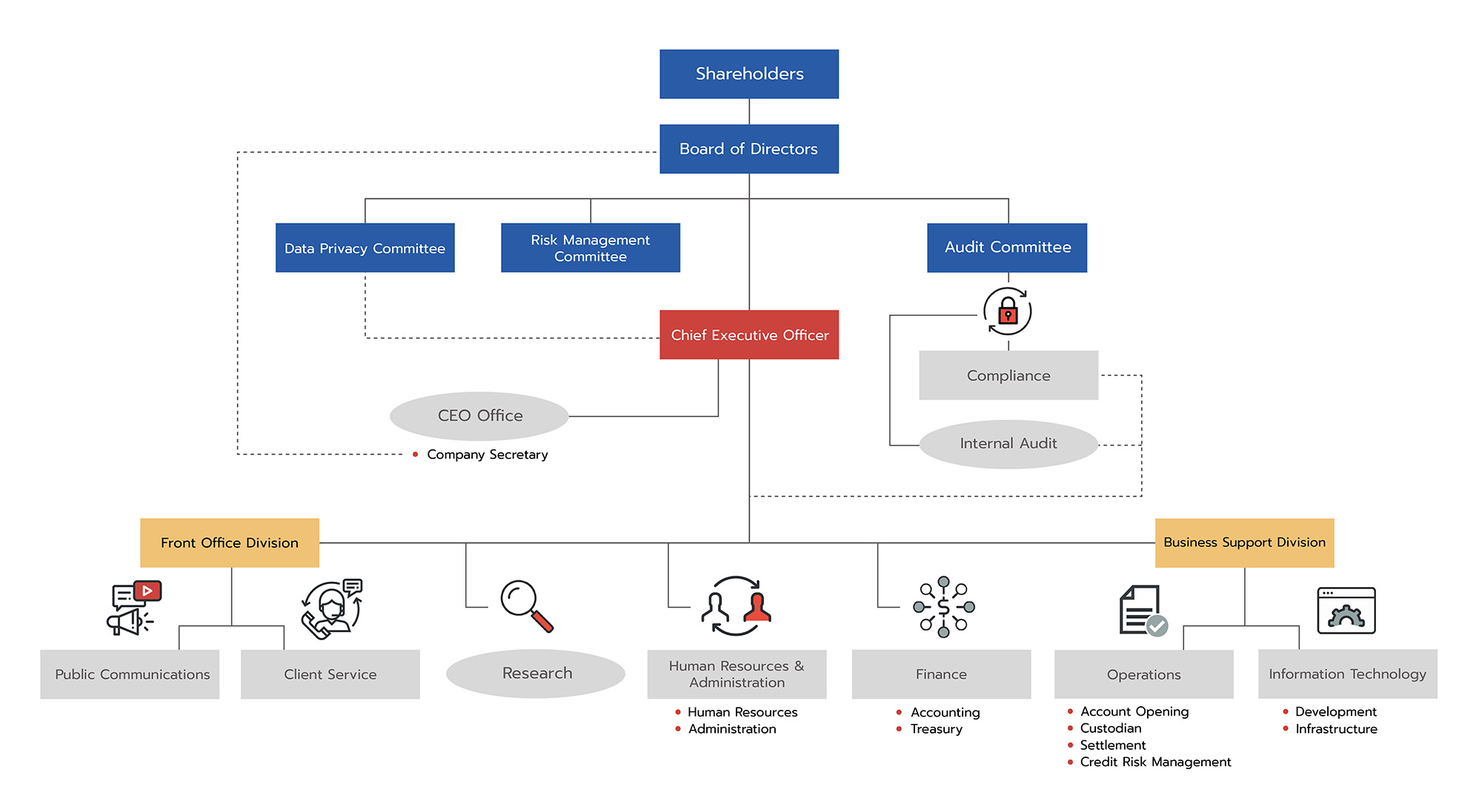 นอกเหนือจากคณะกรรมการของเราแล้ว ยังมีบุคลากรในหน่วยงานอื่น ๆ ดังต่อไปนี้ ฝ่ายกำกับดูแลการปฏิบัติงาน ฝ่ายการสื่อสารการตลาด ฝ่ายการเงิน ฝ่ายทรัพยากรบุคคลและธุรการ ฝ่ายลูกค้าสัมพันธ์ ฝ่ายเทคโนโลยีสารสนเทศ ฝ่ายปฏิบัติการหลักทรัพย์ กลุ่มงานตรวจสอบภายใน กลุ่มงานสนับสนุนงานผู้บริหาร และกลุ่มงานวิเคราะห์หลักทรัพย์